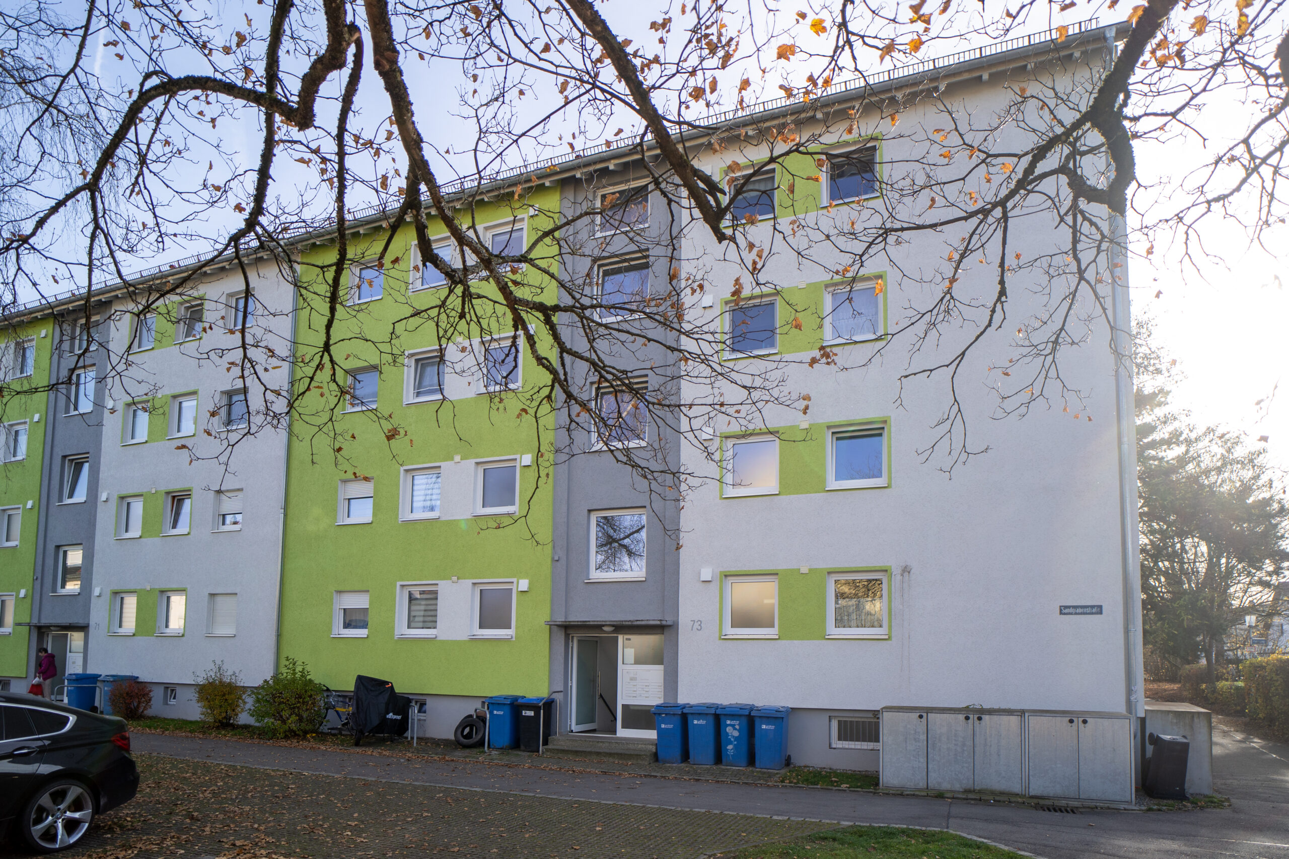 Im Gebäude in der Sandgrabenstr. 71/73 befinden sich 18 Wohneinheiten mit insgesamt 1083 m² Wohnfläche und 7 Garagen.